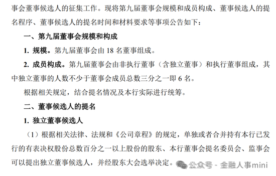 早在去年11月,民生银行就公告征集第九届董事会董事候选人。公告显示,民生银行第九届董事会由非执行董事(含独立董事)和执行董事共计18名成员组成,其中独立董事的人数不少于董事会成员总数三分之一即6名。