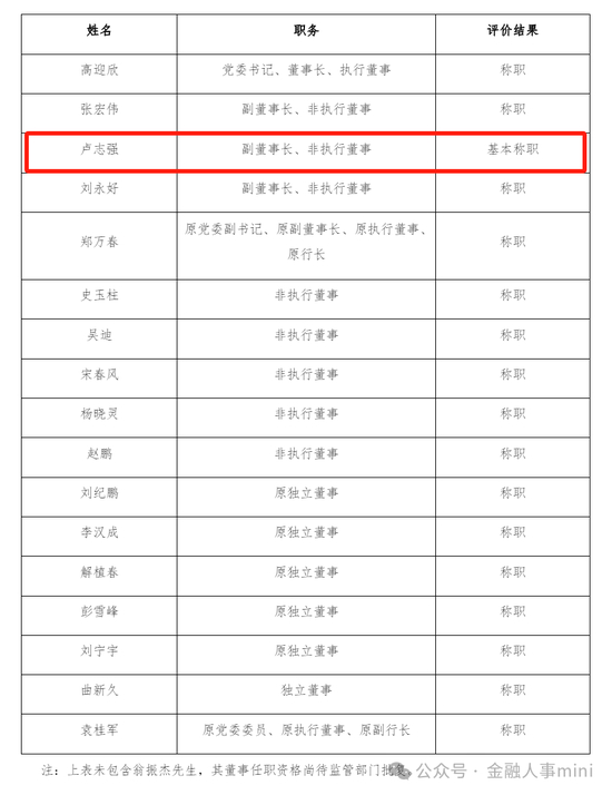 其中,副董事长、非执董事卢志强得到的履职评价结果为“基本称职”,其他董事的评价结果均为“称职”。