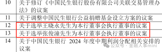 5月31日,民生银行公告通知,2023年年度股东大会将于2024年6月26日召开,届时将会审议关于选举王晓永、张俊潼为执行董事的议案。