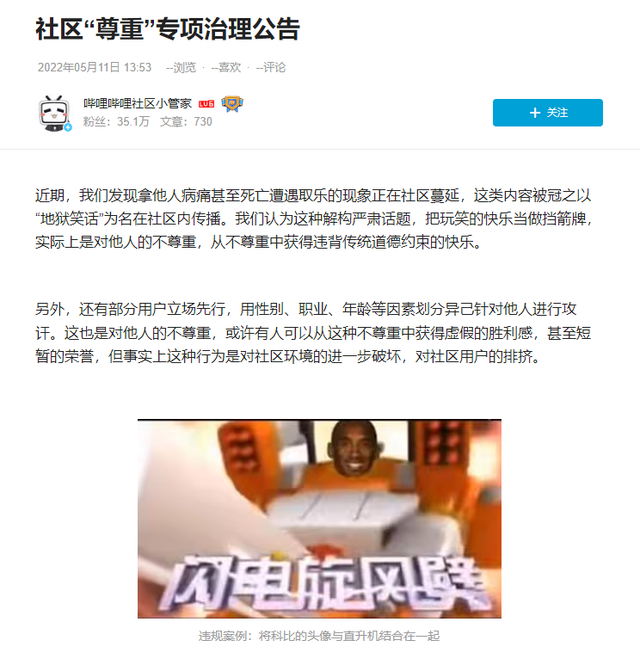 玩梗要适度,即便是娱乐创作也不应丢了基本底线,不喜欢科比可以理性表达,想要模仿致敬也并无不可,唯一不该的是将不幸的事故消解为一场搞笑表演。