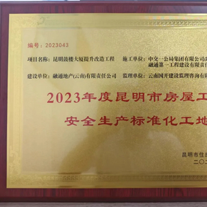 近期,昆明市住房和城乡建设局向融通地产云南公司昆明·融通中心项目颁发了“2023年度昆明市房屋工程安全生产标准化工地”的荣誉奖牌。这一奖项充分体现了地产云南公司安全文明施工标准化管理水平,也树立了云南公司良好的品牌形象。