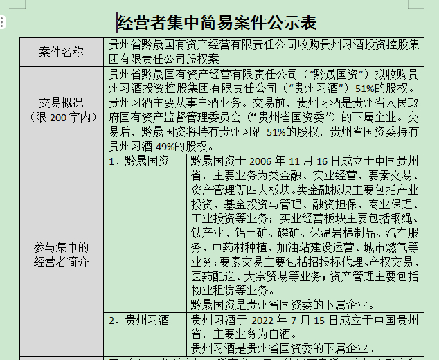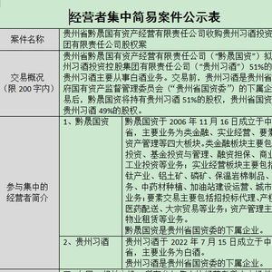 近日,国家市场监督管理总局的经营者集中简易案件公示一栏公示了“贵州省黔晟国有资产经营有限责任公司收购贵州习酒投资控股集团有限责任公司股权案”,据公示内容,贵州省黔晟国有资产经营有限责任公司(简称“黔晟国资”)拟收购贵州习酒投资控股集团有限责任公司51%的股权。