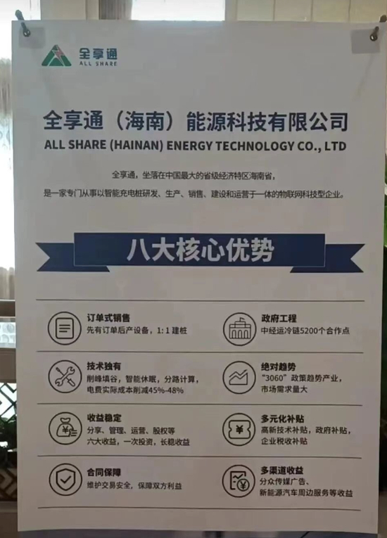 据海口警方通报,全享通通过虚假造势、夸大实力,利用线上线下推广方式面向社会不特定公众销售所谓新能源汽车充电桩产品,并许诺最高投资回报年化率近200%的高额收益,累计吸收6000余名受害人资金10亿余元。