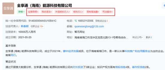 目前,全享通(海南)能源科技有限公司名下已有多项经营异常记录,并存在税收违法、失信被执行人、限制高消费、司法案件等多个负面信息。
