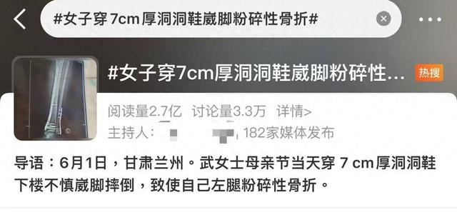 据报道,甘肃兰州的武女士称,母亲节当天她穿7cm厚洞洞鞋下楼不慎崴脚摔倒,致使自己左腿粉碎性骨折。武女士回忆,因为洞洞鞋的鞋底比较厚,脚掌中间又是凹进去的,自己下楼梯的时候正好踩到凹进去的地方,当时脚没有踩稳,整个人的重心往前扑,所有重力都集中在腿上,结果就骨折了。