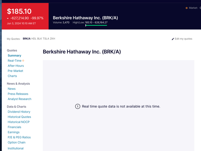 纽交所伯克希尔公司页面显示,公司A类股票价格仅有185.1美元,相比前一个交易日627214美元,下跌幅度高达99%。
