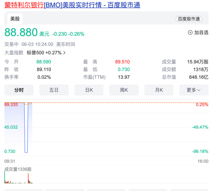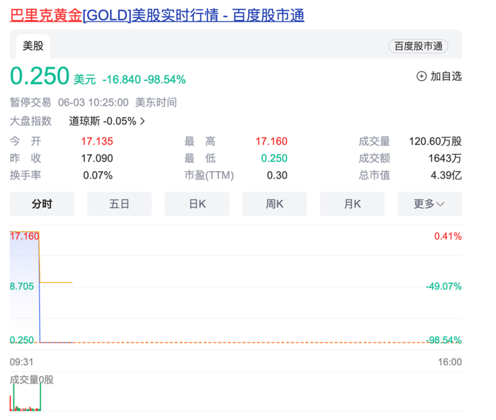 伯克希尔、蒙特利尔银行、巴里克黄金等股票跌幅在98%以上,且行情静止不动。不过,伯克希尔哈撒韦B股暂无异常。