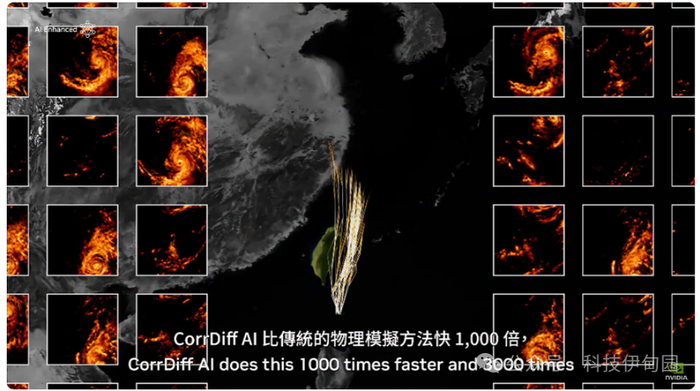 介绍一下NVIDIA earth-2, 一个利用AI物理模拟和电脑图形技术来预测全球气候的数位孪生。CorrDiff是NVIDIA的生成式AI模型,它在WRF数值模拟的基础上训练而成,能够以12倍更高的解析度生成喷气模式,从25公里提高到2公里。这代表了区域天气预测的一个巨大的飞跃。令人惊讶的是,CorrDiffAI比传统的物理模拟方法快1000倍,且能源效率高3000倍。