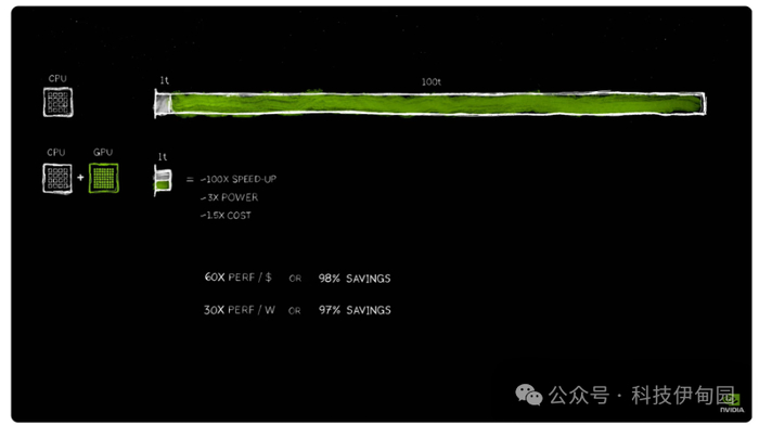 所以我们可以加速,可能以前是要花100个单位来完成的,现在可能只需要一个单位。所以这个加速真的是非常的厉害,听起来好像是难以置信不可思议,听起来非常的不可思议。但是现在我要给大家展示很多的例子。其实这个好处非常的多。因为如果加速100倍,但是它所需要的能耗可能不多,增加所需要的电力可能只有三倍,而成本可能只增加了50%。其实我们在电脑产业常常看到这样子的一个进步。比如说GPU可能是500美元,添加500美元的GeForce的GPU将个人电脑的价值提升到1000美元,然后它的效能大幅增加,资料中心也是一样,可能花10亿美元打造的,我们投资了5亿美元的GPU现在它就可能变成了一个AI工厂,所以其实现在世界各地都看到这样子的一个发展状况,而我们省下来的钱也是非常多的,因为你的每一块钱它的效能增加了60倍。而这个电力只多花了三倍,速度快了100倍,成本才增加了1.5倍。所以你可以想象这里省了多少钱,这个省下来的东西,我们当然首先用美元来去计算。很多的公司,可能他花上亿美元在云端处理资料。如果说可以加速的话,那我们就可以预期,我们可以省下数亿美元。