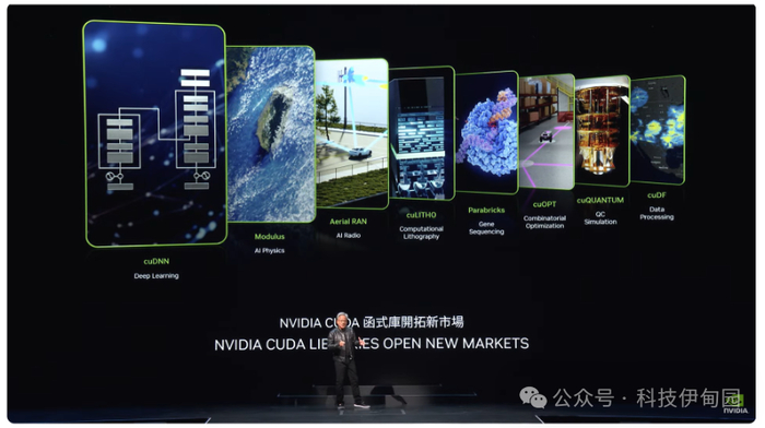 NVIDIA的函数库:NVIDIA开发了350个函数库,支持AI、通信、基因测序等领域,这些库加速了科学研究和工业应用,打破了多项世界纪录;