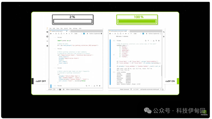 Pandas可以说是现在大家最喜欢用的资料处理的函式库,至少有1万名的资料科学家正在使用,每一个月下载的次数超过1亿次。他其实就是资料科学家他们所使用的excel,现在你只要一个键,你就可以在colab里面来使用这个panda. 而且这是透过cuDF来进行加速处理。我们来看一下它有什么样的效果。真的是很棒的一a个展示,非常简短,可是一目了然。只要我们能够加快资料处理的速度,根本就不用花太多的时间,我们就可以看完整个示范。
