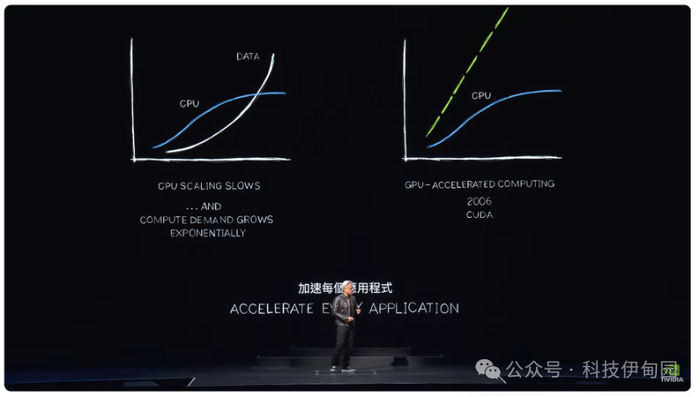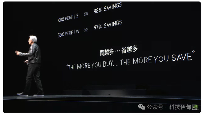 为什么可以做得到呢?原因是很明显的,因为我们过去经历了太多的一般目的的这个通用运算,通膨非常的严重,也持续了很久。现在我们总算可以加速,我们现在可以把我们过去损失的全部都把它弥补回来,我们可以把过去在系统里头浪费的资源都可以把它拿来用。我们等于是说什么,省了很多的钱,省了很多的能源。这就是为什么大家可能听我说过,你买越多就省越多。