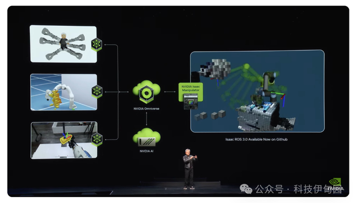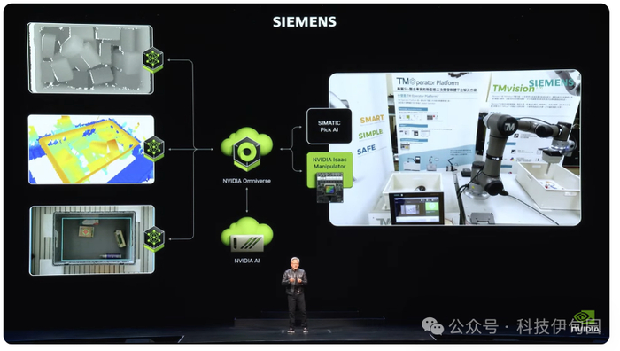 这里有三个不同的电脑,包括了接下来acceleration,一直加速运算,还有训练的模组。这当中我们刚才已经听到了,在Omniverse里头我们有操作系统,有感知系统,这个真的是一个很棒的计划。我们也跟我们伙伴共同合作,Siemenic AI他还整合了IsaccManipulator, 还有很多都是我们的合作伙伴。而西门子的这个也帮我们做了系统的整合。