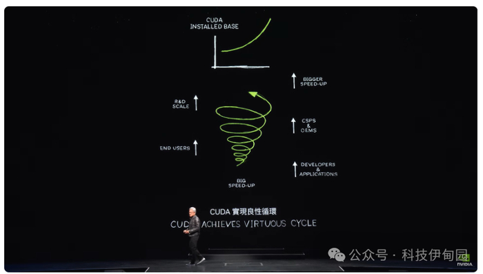 因此,每一次假如我们能够开发更多的应用程式,我们的预算成本就会降低。这就是之前给大家看到的一个良性循环,速度提高了100倍,就可以让我们节省97%,98%的成本。所以假如这个速度是200倍甚至一千倍的话,那我们的成本,开发的成本自然会降得更低。因此,假如我们能够降低运算的成本,而且下降的幅度这么可观的话,那么市场也好,科学家也好,发明家也好,开发人员也好,他们自然就会去开发更多的算法,来使用更多的运算的能力。因此,有朝一日会发生什么样的状况呢?我们运算的边际成本现在这么低,换句话说我们就可以出现新的使用电脑的方式。现在我们已经看到这样的情况了。这么多年下来,我们让运算的边际成本下降了这么多。在过去十年当中,我们可以看到算法它使用的次数越来越多。因此我想现在大家都非常的清楚,我们要训练大型语言模型。我们可以把网络上面所有的资料都拿来使用。这个是我们连想都不用想的事情。最主要的原因就是因为我们的电脑它可以有这么好的运算的能力,所以它可以自己写软件,它可以开发自己的人工智慧系统。最主要的原因就是因为我们的电脑晶片越来越便宜,自然它的用处越来越多,CUDA已经有了这样的一个良性循环,使用人员非常的多,成本下降幅度非常的高,就会有更多的开发人员提出新的想法。这样子就可以驱动更多市场需求。已经打开了一个新的电脑时代。我要告诉大家,假如我们当初没有开发出CUDA,没有开发出生成式AI的一种新的使用模式的话,实际上很多事情都是不可能的。