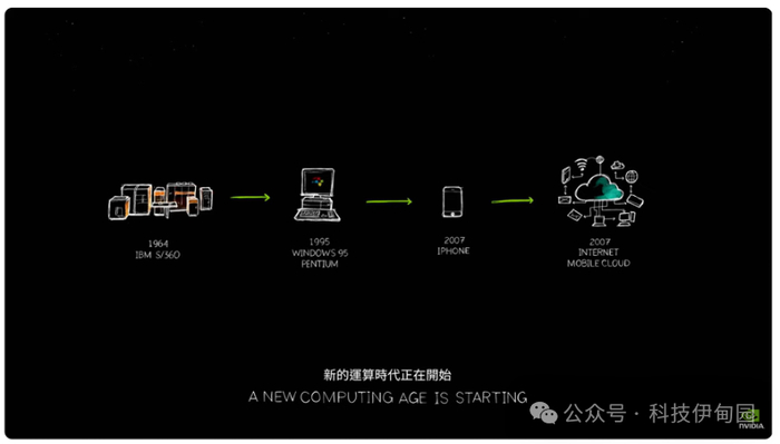 这些都不是动画,而这些全部都是我们自产的,这些是单个的灵魂,我们把它全部都放入这个虚拟世界里,我们把它叫做Omniverse。在大家刚才看到的影片当中的基础就是两个非常重要的技术。第一个是加速运算,第二个就是人工智慧。他们这两个技术都是在Omniverse里头运行的。这两种技术,这两个非常重要的运算力量,会重新打造整个电脑产业。电脑产业已经60岁了,从很多面上来说,我们现在所享受的,其实是我出生1964年之后的那一年才开始的。从360的这个中央处理器,还有这个硬体和软件之间透过操作系统来做一个分割。还有像是多功能或者是IO的操作系统等等这些我们现在所使用的技术,它的这个架构的互容性,还有各种不同的相容性。其实我们今天所知道的这个运算在1964年的时候就已经出现了。当然,个人电脑的革命,让运算人人都可以取得,让每个人都有电脑可以使用。而2007年的iPhone,它当然让移动的运算,把电脑放到我们的口袋里头。至此之后,一切的东西都连接在一起了,大家都通过移动的云端,可以把所有的装置连接在一起。所以在过去这60年,我们看到了一些其实没有那么多,只有一些两三个重大的科技转型。大概两三个的科技转变,这个可以说是在电脑这个产业里头非常重大的转变,一切都改变了。