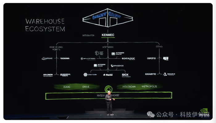 这个不是未来,这个是现在就在发生的事情。我们未来服务市场的方式有很多种。第一个是针对不同的机器人系统来打造平台。第一个是像是机器人的工厂或者是仓库,另外一个则是能够操作东西的机器人。再来是移动的机器人,最后一个是人形的机器人。所以每一个不同的机器人平台,跟我们过去做的一样,就是会有一个电脑有加速的函式库,还有预先训练的模型,然后我们去测试一切,训练一切,把它整合在Omniverse里头。Omniverse就如同影片里头所说的,就是机器人学习怎么成为机器人。当然整个生态系就是机器人的仓库的这个生态是非常的复杂,因为它需要很多的公司,很多的工具,很多的技术才能够让我们打造一个现代的一个仓库。这未来它机器人当然会越来越能够自主。在这些不同的生态体系里会有SDK, 会有API, 它把它连接到各式各样的软件。还有是连接到边缘AI的产业。