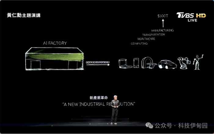 在1980年代末期,Nikola Tesla他发明了AC发电机,可是我们现在发明的是AI的产生系统。AC发电机它产生的是电子,可是我们的AI产生器,它产生的是人工智慧。其实电子也好,AI也好,它都有很高的市场价值,因为每个产业都需要。这就是为什么我们说这是一个全新的工业革命。我们现在有1种新型态的工厂,他们产生的是新形态的大宗商品,每个产业都用得到,具有无比的价值。而他更好的是,他这种方法是可以复制的,是可以扩展的。因此,有没有注意到,现在我们每一天都有一些新的生成式的AI模型被打造出来,因为每个产业都需要。我们第一次看到it产业它的产值有三兆美元,三兆美元的这个产值。现在it产业它即将创造一个东西,它能够去服务这个超过一百兆美元的产业。换句话说,它不再只是工具了,不是为了储存资讯,或者是处理资料而已。IT产业会变成是一个工厂,可以为每一个产业来生成智慧,未来它就变成是一个制造业了,不是电脑的制造业,而是使用电脑来把它制造智慧。那真的是以前没有发生过的事情。真的是很了不起。