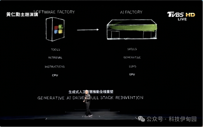 而这个对于我们的产业有什么样子的影响呢?其实影响非常大。当然我们可以创造一个新的商品,一个新的产品,我刚才说是token。我们可以创造这样子的产品给其他产业,但是,其实这个对于我们自己的产业影响也很大。因为六十年来,我刚才有提到,不同的运算方式都在改变。从CPU通用目的的运算,到加速的GPU运算。那么以前电脑需要只是命令,现在,它可以去处理大型语言模型,AI模型。而这些过去的模型运算的模式,它是存取式的。举例来说,你要打电话,那可能你听到他有预录的内容,而且他根据推荐系统来推荐给你,根据你的习惯来推荐给你。但是未来呢?你的电脑它会生成很多东西,但是,它只会存取你所需要的东西。