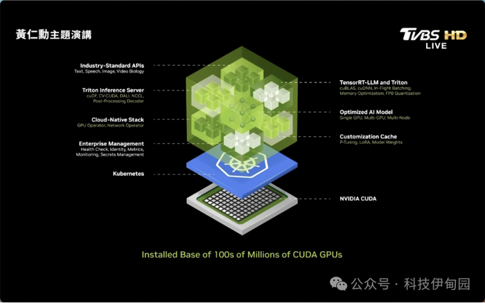 所以我们就去把这个AI装进了一个盒子里头,这些容器,这些container里头,有非常多很棒的软件。在这个容器里头有CUDA、DNN、tensor RT、Triton推理服务,它是在云端上的堆栈。它有通用的API,标准的API,所以基本上你就可以跟这个盒子来对话,你把这个推论维服务下载,你就可以跟他对话,所以只要你的电脑上有CUDA,基本上每个cloud上面都有,有数亿台电脑上面都有。大家把它下载之后,你就有AI,你可以跟他对话,就像你跟GPT对话一样。所有的软件,现在都整合在一起的,四百多个dependency都把它整合在一起,我们测试了这些nims,每一个都是预先训练的模式,他们都是可以安装的在各种云上面,不管是Pascal或者是Ampere,各种不同的版本,Hopper也可以,各式各样不同的版本,我甚至还会忘记有哪一些。所以nims真的是很棒的一个发明,我真的非常的喜欢。