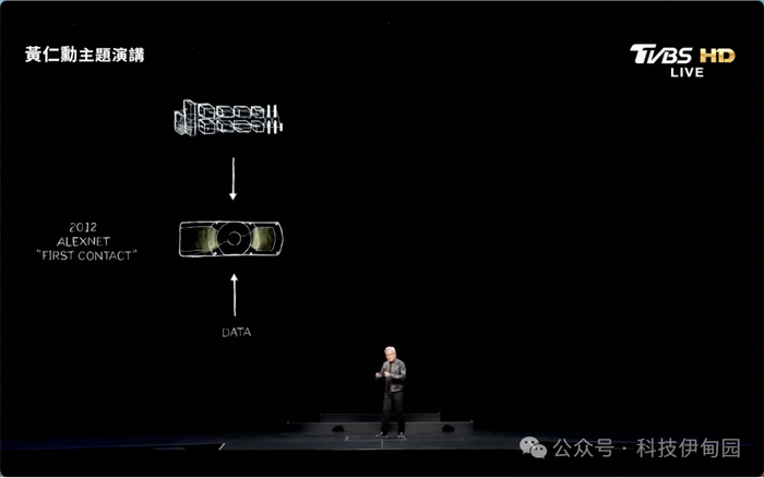 不过在2012年发生了一件很重要的事情。因为我们不断地在改良我们的CUDA,希望能够提升效能,降低成本。因此,AI的研究人员,他们在2012年发现CUDA其实是非常好用的,这个是NVIDIA第一次接触到人工智慧。这个是非常重要的一个日子。