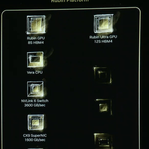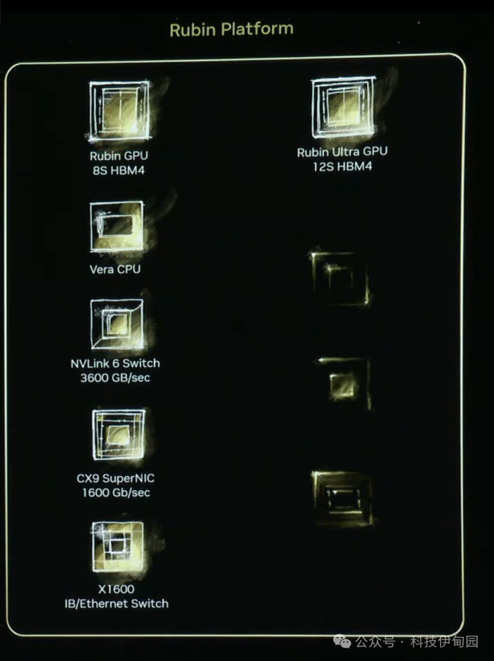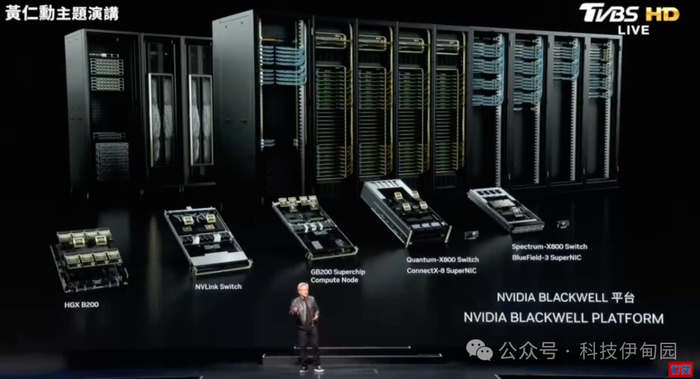 那 Blackwell 现在已经推出了,明年是 Blackwell Ultra,我们之前有H100、H200。那因此大家未来会看到新的Blackwell,下一代就是 Blackwell Ultra,一样是推到极限,那还有下一代的 Spectrum switch,那这个是我们第一次给大家看这个。我们公司里头有各式各样的开发代码,我们尽量地保密,有的时候大部分的员工甚至都不晓得这些开发码是什么。但是我们下一个平台叫做 Rubin 的,这个平台我不会花太多时间讲,因为我知道会发生什么事情,大家一定会拍照,然后会去想办法去看它里头的这个细节。