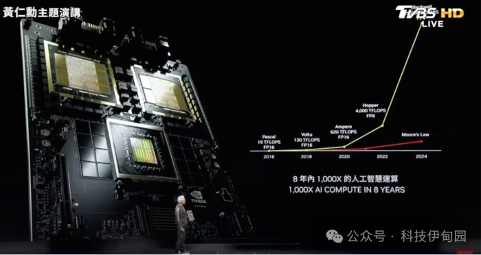 而且它两个串联起来的时候,它的连接的速度是 10 个TB,这个是 Blackwell 的电脑,它的效能非常的强大,请各位注意一下我们的荧幕上面所秀出来的。我们来看一下它的浮点运算能力,每一代的产品,它的浮点运算能力几乎 8 年内增加了 1,000 倍。摩尔定律,如果是经过 8 年的话,顶多我们算一下大概 40 倍,顶多对不对? 40 倍? 60 倍。可是在过去这 8 年当中,摩尔定律它的速度已经变慢了,所以我们来做个比较,即便是在摩尔定律的巅峰时期拿来跟 Blackwell 做一个比较。其实 Blackwell 我们看到这个GPU 的运算能力,它进步的速度真的太快了,而且它的成本会不断的下降。