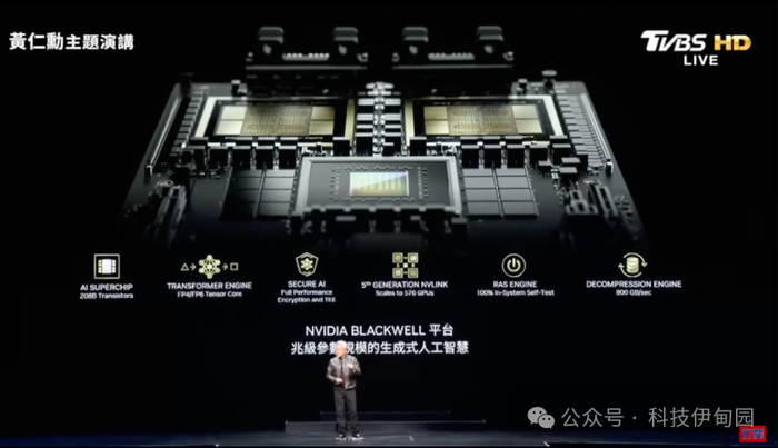 那么这个都是Blackwell,我们这边有一个已经在生产中的Blackwell,在GTC,我有给大家看Blackwell,它是一个原型。这就是我们正式生产的 Blackwell,里头有最尖端的科技。这就是我们实际生产的一个版,可以说是有史以来功能效能最强大的一个晶片。这个是我们的 CPU 每一个裸金,应该说我们把两个 GPU 的裸晶串联在一起,这可以说是世界上我们可以生产出来的最大的晶片。