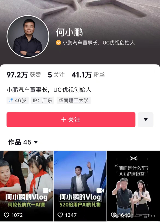 何小鹏虽然也偶尔发个短视频,但没怎么做IP方面的工作。