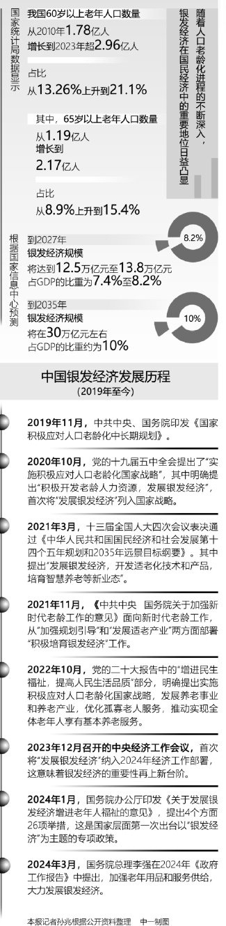 中央经济工作会议和2024年《政府工作报告》均明确提出,要大力发展银发经济。今年1月,国务院办公厅印发的《关于发展银发经济增进老年人福祉的意见》也提出“加快银发经济规模化、标准化、集群化、品牌化发展,培育高精尖产品和高品质服务模式”。根据国家统计局发布的数据,2023年末,我国60周岁及以上人口超2.96亿。可以说,发展银发经济是积极应对人口老龄化的客观要求,与此同时,银发经济涉及面广、产业链长、业态多元,孕育着巨大的新机遇。未来,要坚持问题导向,统筹供需协同发力,持续推动银发经济高质量发展。