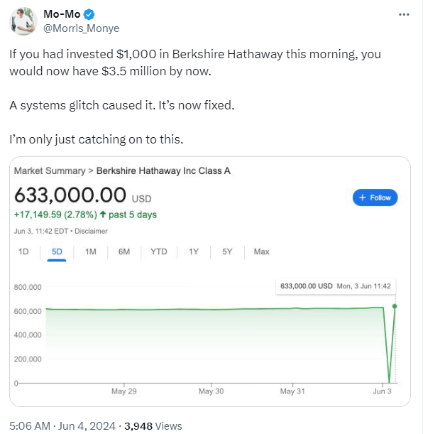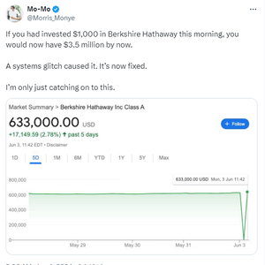 对此,有网友表示:“如果你今天早上在伯克希尔哈撒韦公司投资了1000美元,那么现在你就会拥有350万美元。这是系统故障造成的。现在已经修好了。我刚刚才意识到这一点。”