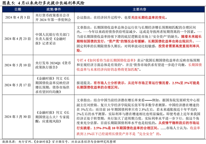 3)5月30日,央行再次提示长端利率债风险。央行旗下《金融时报》刊文提示“2.5%-3%是10年期国债收益率的合理区间……收益率跌到2.5%以下已经说明长债资产并不是‘完全安全’的”,4月以来,央行已经连续5次提示长端利率风险,这对债市交易情绪形成扰动。