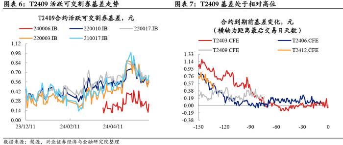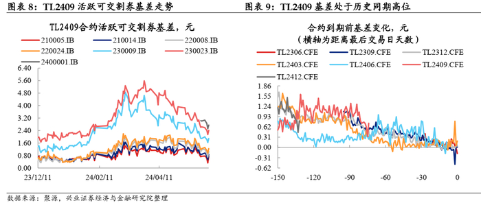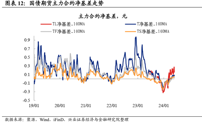 5月20日-5月31日期间,国债期货2409合约中TS基差有所上升,其它品种基差则有所收窄,TL基差仍然维持历史同期最高位,且2409合约所有品种的测算净基差均大于0。5月31日,TS2409、TF2409、T2409、TL2409合约基差分别为0.13元,0.27元,0.23元,0.73元。从测算的净基差的角度,2409合约各品种净基差均大于0。相较于现券,期债的价格存在不同程度的贴水,这也是近期债市受多重因素扰动后,投资者对债市谨慎情绪的体现。