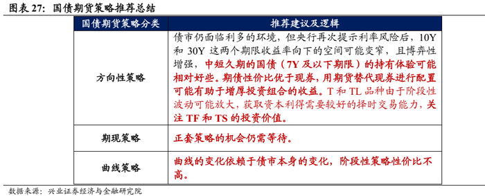 1)债市仍面临利多的环境,但央行再次提示利率风险后,10Y和30Y这两个期限收益率向下的空间可能变窄,且博弈性增强,中短久期的国债(7Y及以下期限)的持有体验可能相对好些。期债性价比优于现券,用期货替代现券进行配置可能有助于增厚投资组合的收益。T和TL品种由于阶段性波动可能放大,获取资本利得需要较好的择时交易能力,关注TF和TS的投资价值。