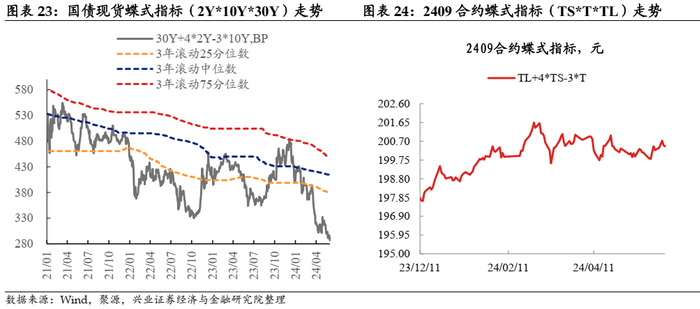 蝶式指标而言,5月20日-5月31日期间,现券蝶式指标2Y*5Y*10Y、5Y*10Y*30Y指标均明显变凸。期货2409合约蝶式指标除TS*TF*T指标小幅变凹以外,TS*T*TL、TF*T*TL指标走势与现券指标基本一致。