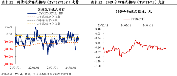 5月20日-5月31日期间,国债2Y和30Y表现好于10Y和5Y,国债10Y-2Y小幅变陡,30Y-10Y小幅变平,但期债的曲线指标走势则与现券存在差异。截至5月31日,现券5Y-2Y利差约为28.6BP,位于3年滚动75分位数下方;现券10Y-5Y利差约为20.8BP,位于3年滚动75分位数上方;现券10Y-2Y利差约为49.4BP,接近3年滚动75分位数水平;现券30Y-10Y利差约为26.3BP,位于3年滚动25分位数附近。期债方面,2409合约中由于TS基差表现和其它品种存在差异,且T合约的CTD剩余期限约为6.8年(非10年的券),期债2409合约跨品种价差指标中仅有3*T-TL与现券期限利差走势基本一致,其它指标(2*TS-TF,2*TF-T,4*TS-T)表现与现券指标相反。
