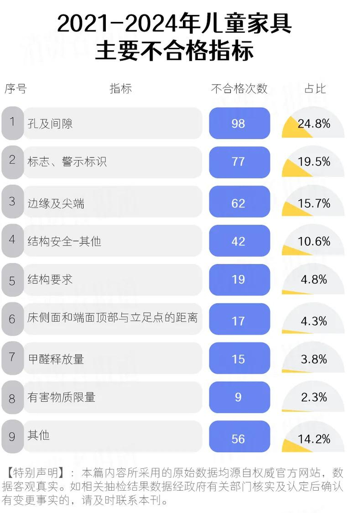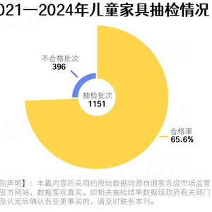 2024年5月,《消费者报道》整理了国家市场监督管理总局及省市级市场监督管理局于2021-2024年发布的儿童家具抽检情况,并汇总分析数据。