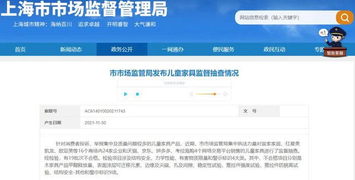 2021年11月,上海市市场监督管理局发布儿童家具监督抽查情况,3批次标称由“宜家(中国)投资有限公司”生产的儿童家具不合格,产品涉及两斗抽屉柜、TROFAST舒法特、BUSUNGE布松纳,主要不合格项目均是警示标识。