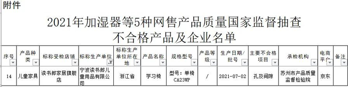 2022年3月,国家市场监督管理总局发布产品质量国家监督抽查情况通报,1批次标称由“宁波读书郎儿童用品有限公司”生产的学习椅不合格,主要不合格项目为孔及间隙。