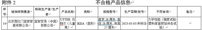 2023年12月,北京市市场监督管理局发布北京市婴幼儿及儿童家具产品质量监督抽查结果公示,1批次标称由“宜家贸易(中国)有限公司”生产的“IKEA(图形)” UTTER 乌特尔(儿童凳)不合格, 不符合项为力学性能(强度试验-塑料座面附加冲击试验)。
