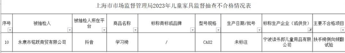 另外,标称由“宁波读书郎儿童用品有限公司”生产的儿童家具也被检出2批次不合格。2023年6月,上海市市场监督管理局发布儿童家具监督抽查情况,1批次标称由“宁波读书郎儿童用品有限公司”生产或供货的学习椅不合格,主要不合格项目为扶手椅侧向倾翻试验。