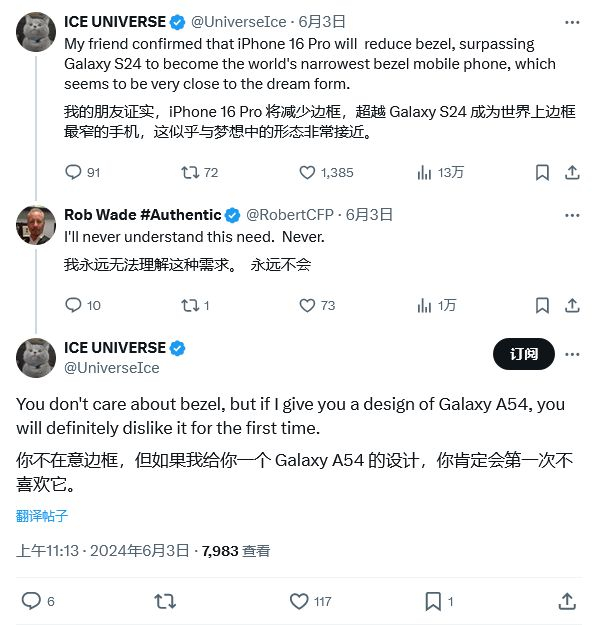 IT之家 6 月 4 日消息,消息源 @i 冰宇宙昨日(6 月 3 日)在 X 平台发布推文,曝料称苹果 iPhone 16 Pro 将收窄边框,超过三星 Galaxy S24 手机,成为全球边框最窄的手机。
