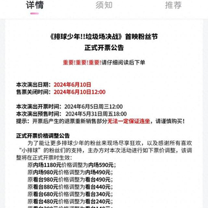 6月3日,因价格过高遭到粉丝群起吐槽的剧场版动画《排球少年!!垃圾场决战》首映粉丝节演出门票宣布调价,所有档位价格在原预售价格的基础上打五折重新出售。