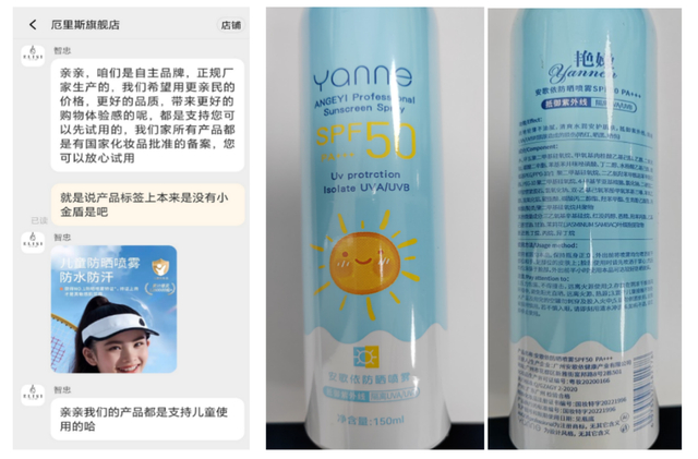 淘宝天猫厄里斯旗舰店经销的产品信息关键词组合为“儿童防晒霜宝宝幼婴儿男女学生小孩子专用大人通用喷雾防晒乳50倍”,备案名称“安歌依防晒喷雾SPF50 PA+++”系普通人群化妆品,产品没有“小金盾”标识,但在网页上多处宣称适用于儿童,并虚标了“小金盾”标识,客服还在与消费者的对话中强调是支持儿童使用的。