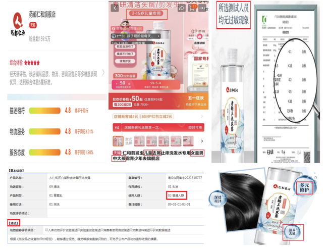 淘宝天猫药都仁和旗舰店经销的产品信息关键词组合为“仁和剪发虫儿童去屑止痒洗发水专用女童男中大孩露青少年去旗舰店”,备案名称“人仁和匠心爱肤宜老醋王洗发露”系普通人群化妆品,没有“小金盾”标识,标签标注使用人群为普通人群,但在网页上多处宣称适用于儿童。此外,该产品备案的功效只有保湿,但在网页上多处有去屑、修护、滋养等功效宣称的字样;网页中提及的“所选测试人员均无过敏现象”字样旁的报告非致敏性测试报告。