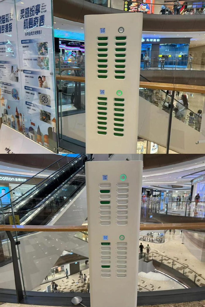 6月1日下午,记者在济南万象城注意到,商场内每层扶梯口或附近均设有“小电”共享充电宝设备,各点位充电宝的租借情况不一,仅有1至2个柜机处于满机状态。扫码发现,当柜机内充电宝无法租借时,系统会智能推荐附近的柜机供用户选择。同样,在济南印象城商场内,也使用了“小电”共享充电宝设备,这些设备同样被放置在扶梯旁。此外,在两家商场内的电影院则使用了“美团”共享充电宝设备,均未出现满机状态。