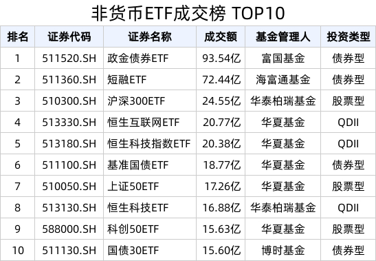 截至今日收盘,政金债券ETF、短融ETF、沪深300ETF成交额居市场前列,分别达93.54亿、72.44亿、24.55亿。宽基类ETF共计3只,分别是沪深300ETF、上证50ETF、科创50ETF。行业主题类ETF共计3只,分别是恒生互联网ETF、恒生科技指数ETF、恒生科技ETF。