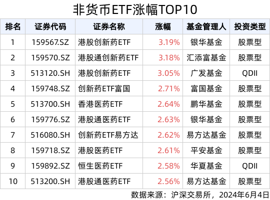 ETF英雄汇(2024年6月4日):港股创新药ETF(159567.SZ)领涨、纳指科技ETF(159509.SZ)溢价明显