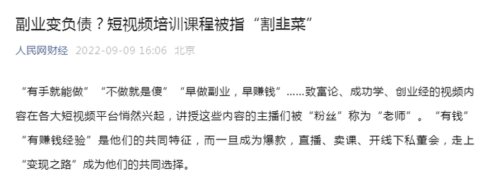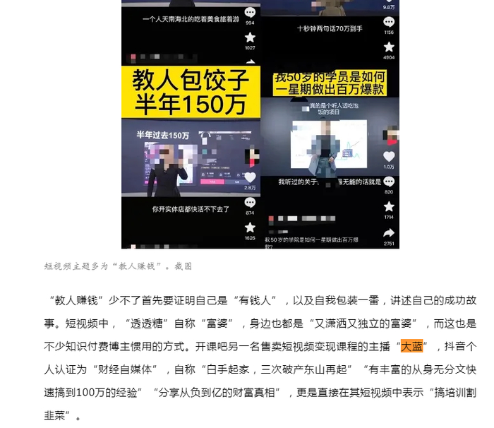 2022年,在央媒发布的一篇题为《副业变负债?短视频培训课程被指“割韭菜”》的报道,曾点名“大蓝”的账号。