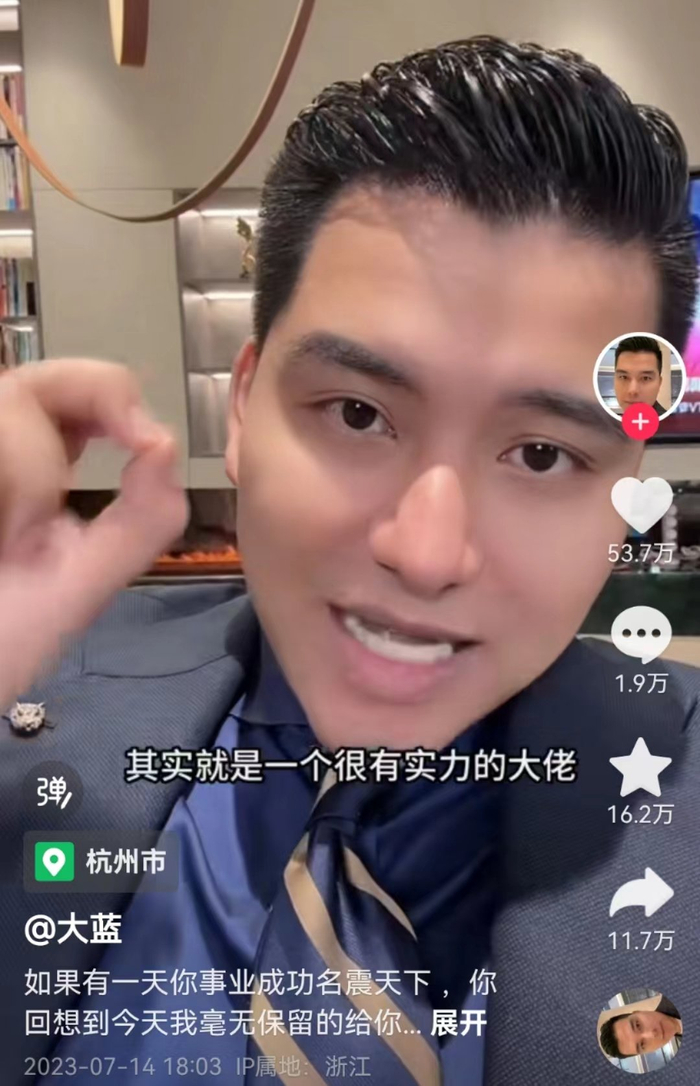 大蓝,浙江衢州人,原名蓝天航,早年间是一名健身教练,但因为口才好还有商业头脑,2015年左右就进入了微商行业,做的当然也是和健身相关的生意——健身餐。由于主要产品是“定制周/月参”因此私域流量至关重要,为了能够给自己的公司招代理,大蓝运营起了抖音账号,自此尝到了流量的甜头。