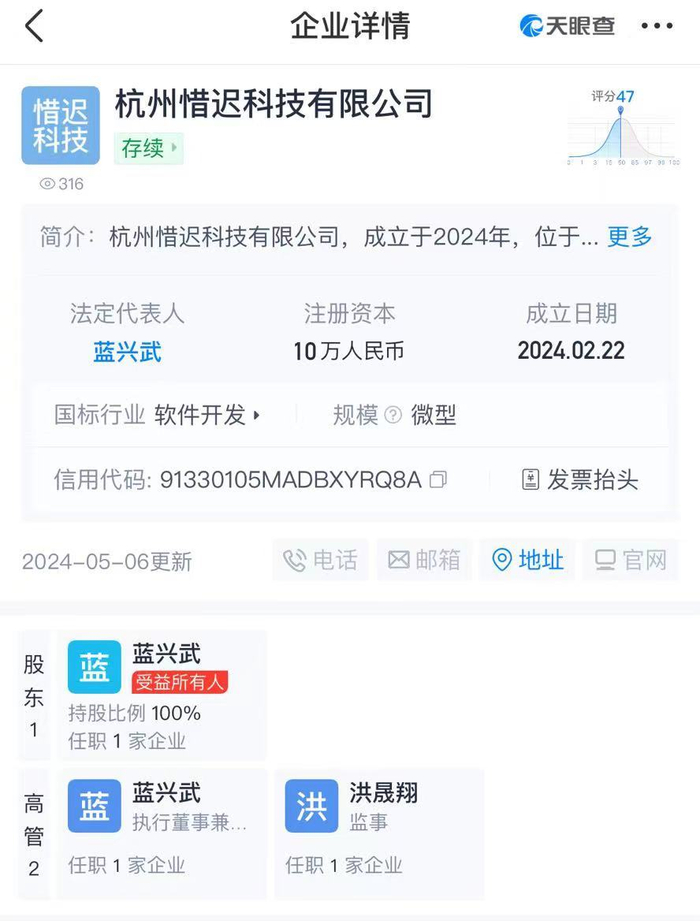 天眼查App显示,杭州惜迟科技有限公司成立于今年2月,注册资本10万元人民币,法定代表人为蓝兴武,由蓝兴武全资持股。值得一的是,“大蓝”(本名蓝天航)与蓝兴武存在合作关系,今年4月,两人共同投资了海南兴传农业发展有限公司,分别持股68%、32%。